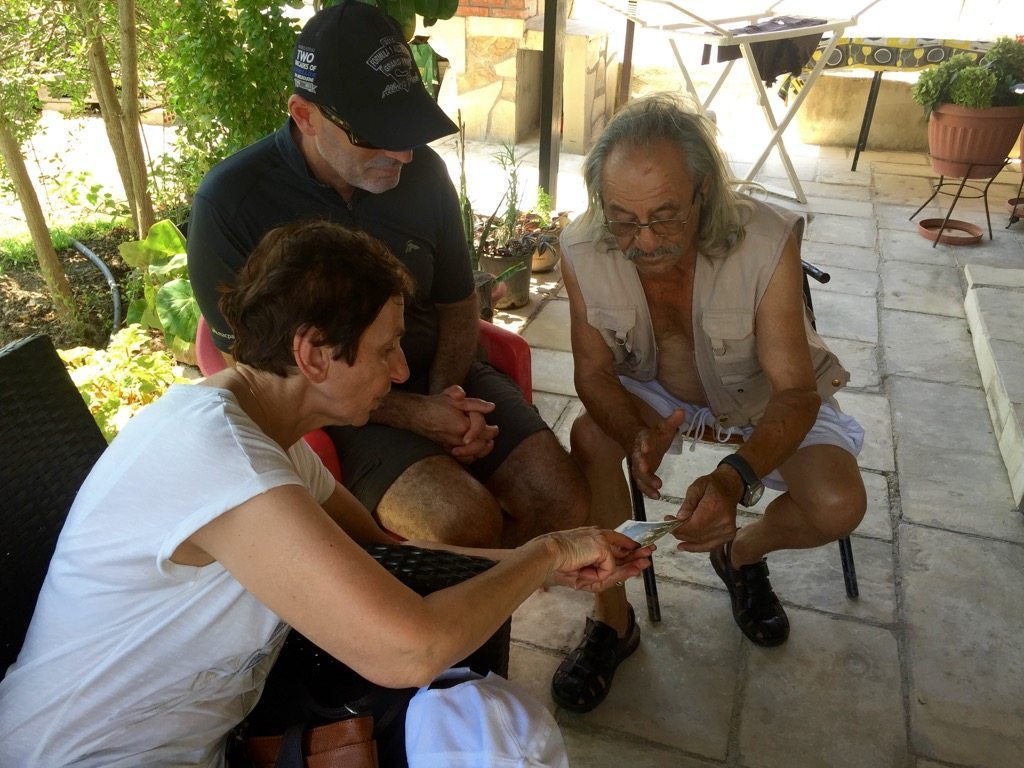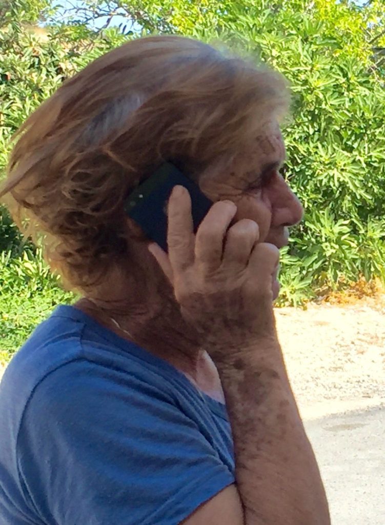 Katie walked into the home of an elderly couple whose front door was open. In Greek, she spoke to them, they invited us in, offered us plums from their tree and engaged in conversation with Katie. Using Con’s mobile, the elderly lady called the Mayor who said he would come meet us in ten minutes. He pulled up in a Mercedes, was smartly dressed in leather shoes, black pants and a white shirt with a lace-up neckline. His smile under his big white moustache said he was a friendly chap. Despite not knowing Katie’s father or the house where he grew up, he did write a book about everyone in the town that Katie got talked into buying for 50 Euro. The Mayor apologised that he couldn’t help us, but suggested we walk up another hill to the teacher’s house and ask him.
