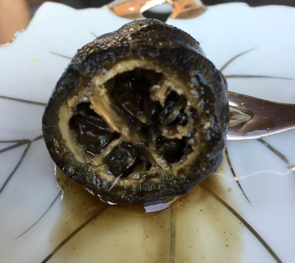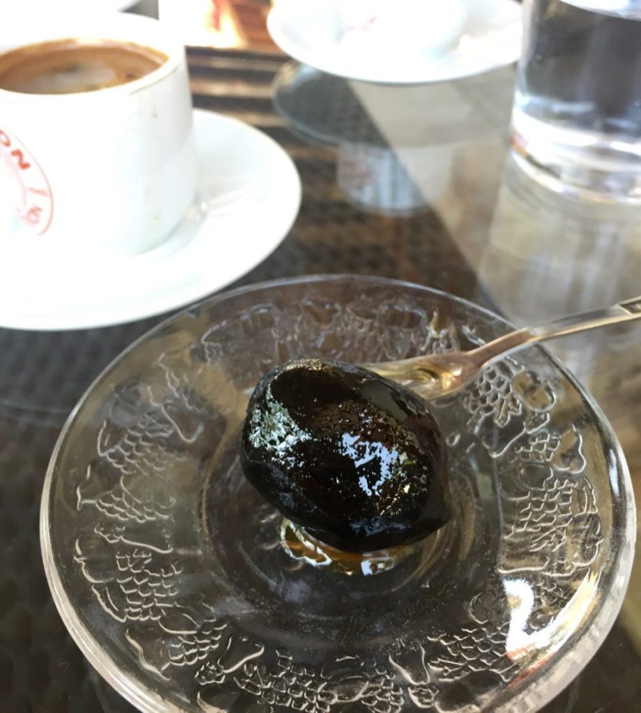 We had Cypriot coffee and a delicious Cypriot sweet – Karidaki Glyko – a fresh whole walnut, husk, shell and nut, that’s been leached and then placed in a jar with honey syrup. When I asked, Georgios’ wife Nitsa explained how she made them. The whole walnut fruit had to be soaked in water for seven days, changing the water daily. On the eighth day, add lime powder (which contains calcium hydroxide) to fresh water. Then you have to wash the walnuts three times. You have to be very careful to rinse the walnuts very well after a day soaked in that. Then pierce the walnuts, stick a clove in each one and make the honey syrup with cinnamon and cloves. I found a recipe that is very close to the way Nitsa explained how to make these sweet delicious walnut sweets – click here.