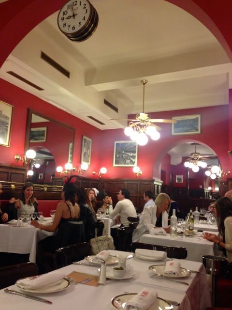 Walking inside, it was just how I imagined a French brasserie to be – ornate globed light fittings, deep red walls broken up with wood panelling, white table clothes and napkins, quality cutlery and glassware, mirrors and black and white photographic prints on the walls. The wait staff were smartly dressed in black and whites with ties, vests and uniform aprons.