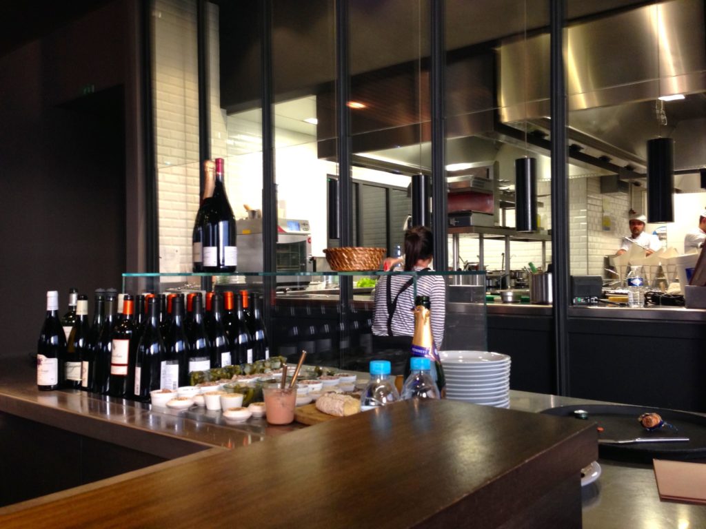 Walking in, there’s a huge floor to ceiling blackboard on the right and straight in front is a large central bar, surround by bar stools. We were early for a Parisien dinner, about 8.15pm on a Tuesday, however, the place quickly filled up and soon had patrons waiting. One review we had read said that sitting at the bar offered a great view of the kitchen and the staff at work. We opted to sit there.  Oozy cheeses and potted desserts were on display in the glass cabinet at the end, near where we were sitting.